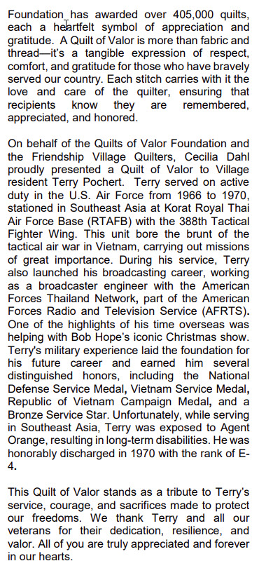 A Quilt of Valor® (QOV) is a quality, handmade quilt that is machine or hand quilted. It is awarded to a Service Member or Veteran who has been touched by war. The Quilt says unequivocally, “Thank you for your service and sacrifice in serving our nation.” Terry Pochert is very grateful to the quilters of Friendship Village, Tempe, Arizona.